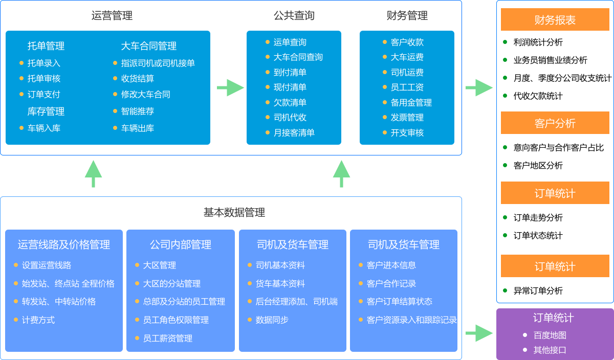 快速与下游承运商进行无缝对接 一键分单,快速智能匹配承运商 物流可视化跟踪,货物动向一手掌握 多样化的数据报表,个性化的数据分析